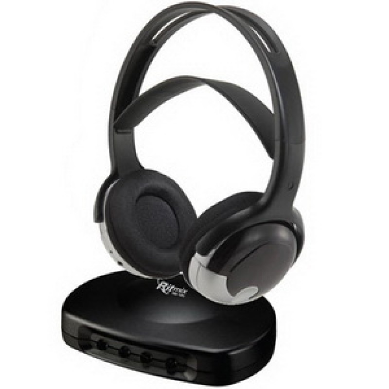 Наушники RITMIX RH-711. Беспроводные, закрытого типа. Диапазон частот: 18-22000 Гц. Питание: 2 x AAA. Зарядка аккумуляторов при помещении наушников на базу. Радиус действия: 10 м.