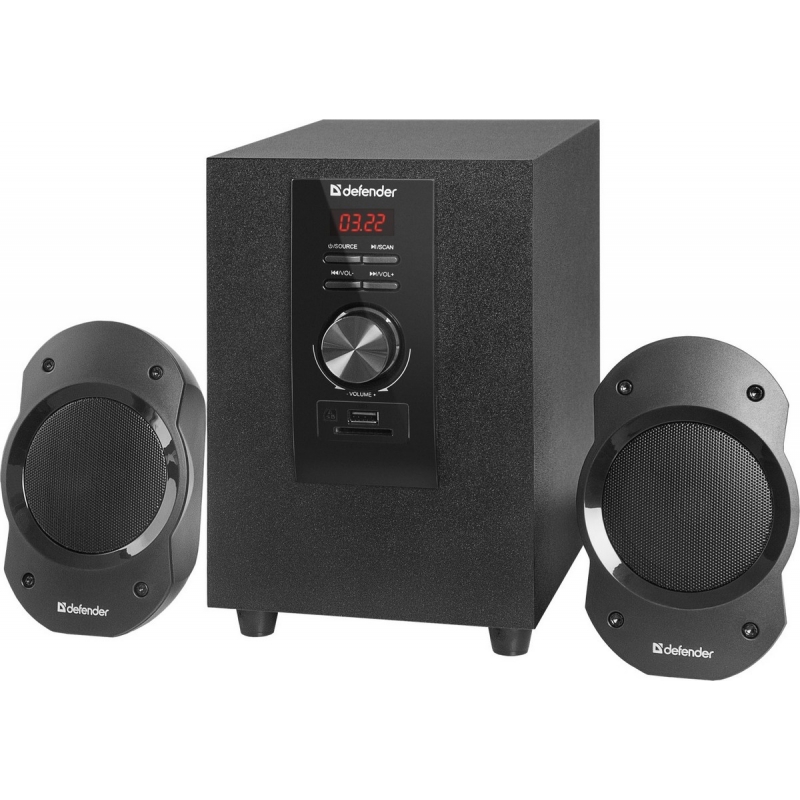 Активная система DEFENDER Sirocco S10 Pro, 2.1. Корпус сабвуфера: дерево; сателлитов: пластик. Регуляторы громкости тембра. Беспроводной пульт ДУ. Диапазон частот сабвуфера: 30-150 Гц. Мощность сабвуфера: 5 Вт. Мощность сателлитов: 2x2.5 Вт. Поддержка USB/SD. Встроенный FM-тюнер. (1/8)
