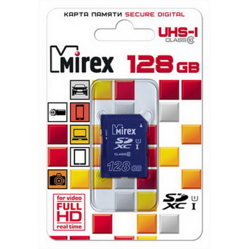 Карта памяти SDXC 128 Gb MIREX Class 10 UHS-I. Используется в фотоаппаратах, видеокамерах, видеорегистраторах и любых других устройствах поддерживающих формат SDXC.