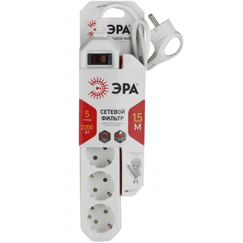 Сетевой фильтр ЭРА USF-5es-1.5m-W, 5 гнезд, выкл., заземление, белый, 1,5 м. (20/600)