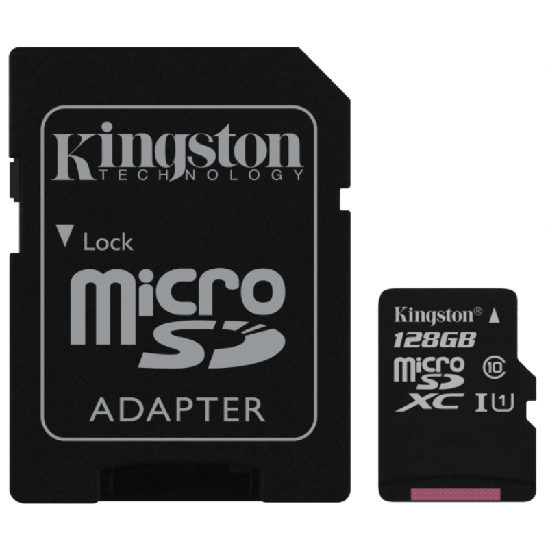 Карта памяти MicroSDXC на 128 Гб Kingston класс 10 UHS-I с адаптером. Скорость чтения 45 Мб/сек., скорость записи до 10 Мб/сек. Прекрасно подойдет для использования в устройствах, поддерживающих съемку FullHD (1080).