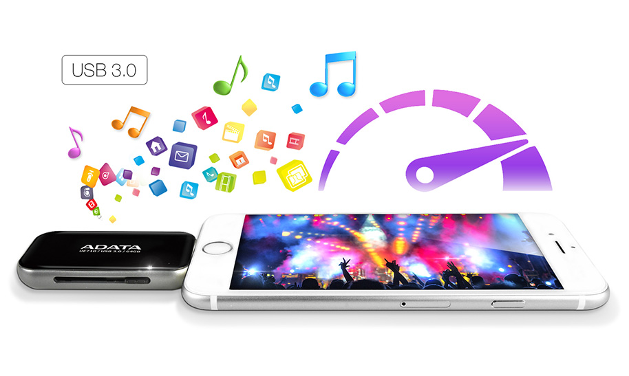 Флэшка UE710 с двумя разъемами – USB и Lightning (с сертификатом Apple) – предназначена для широкого круга пользователей. Флэш-диск поддерживает устройства iPhone, iPad и iPod и обеспечивает передачу данных и сверхчетких видеоизображений в формате Ultra HD.
